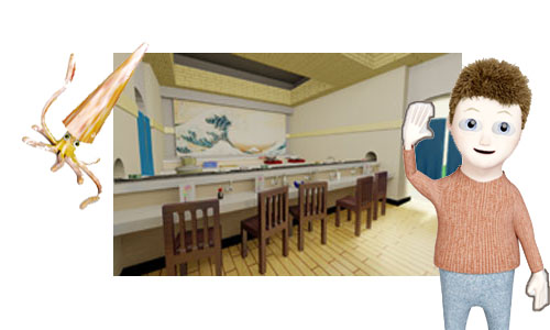 |   | Story - A Kid and A SquidA kid enters a sushi restaurant witnessing a squid being chopped on the cutting board by the Chef. The audience is then introduced to the interior setting, Japanese food and cooking. The main story is about the kid choosing a mysterious plate from the sushi belt which happens to be the chopped squid he has just seen. Half curious and half nervous, the kid decides not to upset the chef and goes ahead to eat the squid. He goes to pick up some soy sauce but when he returns, he is astonished to find an empty plate. He looks around without a trace of the squid. In confusion, he drops his bowl of rice and falls from his chair. When he regathers himself and stands up, he finds the shadow of a giant squid approaching him. He then ......